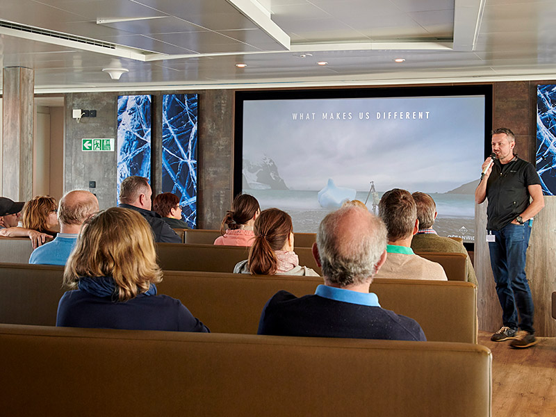 In de Lecture Room op dek 5 worden lezingen georganiseerd door de expeditiestaff. Eén voor één experten in hun vakgebied: biologen, glaciologen, ornithologen, geologen… Allemaal even gepassioneerd om hun kennis te delen.